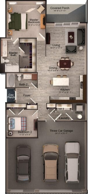 A wildly popular single-level twinhome floor plan, the Madison is ideal for anyone looking for well-appointed living without having to worry about a lot of maintenance or upkeep. From first-time buyers to empty-nesters looking for comfortable living and room for grandkids to play, the Madison has advantages for every buyer at every stage of life. Two bedrooms, two bathrooms and a nice big 3-stall garage gives you all the room you need without any wasted space.